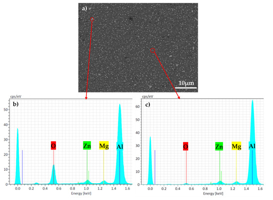 As can be seen from Figure 2a, a homogeneous distribution of Al2O3 nanoparticles is shown, with their agglomeration in colonies homogenously dispersed along with the aluminum matrix, with an average size of approximately 0.5 to 1 µm in spherical-shape particles bunches. Additionally, Figure 2b presents the SEM-EDS as of one of the agglomerated nanoparticles, wherein it is possible to detect high oxygen content that is one of the main elements that constitute the Al2O3 reinforcement. On the other hand, Figure 2c shows some agglomerated nanoparticles, where an oxygen content reduction can be seen due to the majority concentration of the matrix. In this context, Zaiemyekeh et al. [25] suggested that the homogeneous distribution of Al2O3 nanoparticles in an aluminum matrix composite reveals the correct use of the process to fabricate the specimens.