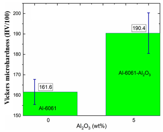 Results presented in Figure 3 show that microhardness was significantly higher in the Al-6061-Al2O3 than in the Al-6061 alloy. In this part, several strengthening mechanisms are considered, such as thermal mismatch during the sintering stage. However, due to the nature of the synthesis process, an important strengthening mechanism considers the excellent dispersion of the nanoparticles during the milling process [26,27], producing an efficient transfer load from the matrix to the reinforcement. Furthermore, due to the size of the reinforcement, the dispersion of these fine nanometric ceramic particles in the alloy produces free path obstacles in the movement of dislocations in the subgrain structure, enhancing their hardness [28]. Additionally, hard particles of Al2O3 can be associated with stress concentration around particle corners which tends to be reduced as a function of the reduction in the size of alumina particles, as was suggested by Mamoon [29]. In their studies about the effect of different sizes of Al2O3 nanoparticles on 6066AA and 7005AA composites on mechanical properties, it was mentioned that 20 nm particle size enhances the best mechanical properties like UTS (Ultimate Tensile Stress). In this context, it is essential to note that the same size was used in the present work.