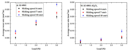 Figure 5 shows the average wear rate of the specimens as a function of the applied load for the alloy and the composite (Al-6061 and Al-6061-Al2O3 with 5 wt.% nanoparticles, respectively). Again, a similar trend in the wear behavior in both materials was observed: the average wear rate increased as load and sliding speed increased. In this regard, it was suggested that an increment in the applied load tends to increase the penetration of hard asperities of the counterface into the softer sample under evaluation, which generates the removal of particles in the softer material [33,34,35,36,37].