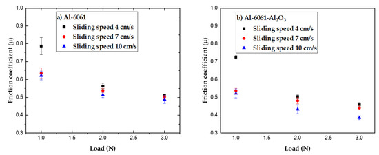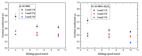 Figure 6 and Figure 7 show friction coefficients as a function of the applied load and sliding speed for both materials (Al-6061 and Al-6061-Al2O3).