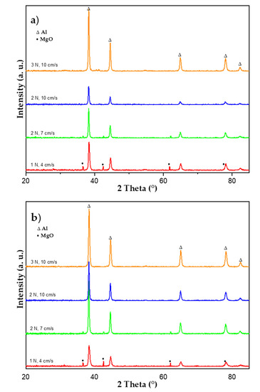 The detection of a second phase identified as MgO product of the high temperatures reached during the different test conditions can be observed in the XRD patterns. This phase is related to the formation of a tribolayer that reduces the friction coefficient, but cannot be well attached to substrate in order to reduce the wear rate [40]. This oxide formation seems to disappear as load and sliding speed increases. In a range from low load and sliding speed (1 N, 4 cm/s) to medium load and sliding speed (2 N, 7 cm/s), the MgO formation is evident, but in a range from medium load and high sliding speed (2 N, 10 cm/s) to high load and sliding speed (3 N, 10 cm/s), the MgO formation was not detected. This behavior suggests that under low and medium load and sliding speed (1 N, 4 cm/s to 2 N, 7 cm/s), more oxide formations are detached from the contact surface in comparison with a range from 2 N, 10 cm/s to 3 N, 10 cm/s.