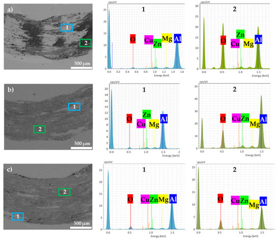 From Figure 9a–c and Figure 10a–c, two main zones can be observed. The first one corresponds to a white zone identified as the base material, which is supported by the SEM-EDS analysis (Figure 9a–c and Figure 10a–c (1)), where the low content of oxygen and several of the elements that constitute the aluminum matrix composite (Al, Zn, Mg, Cu) can be detected. In addition, a second dark zone depicts a mixture of delamination and fragmentation of a fine oxide layer; the morphology suggests particles of the counterface. Again, the SEM-EDS analysis supports the evidence (Figure 9a–c and Figure 10a–c (2)) where it is possible to observe high oxygen content. It is evident that a change in tonality from white (base material) to dark (mixture of delamination and compaction of the suggested fine oxide layer) occurs as load and sliding speed increases, which reduces the friction coefficient, but cannot be sufficient to reduce the wear rate. This behavior is in concordance with the XRD results, wherein it was possible to detect MgO in the wear debris, mainly at low and medium load and sliding speed, which suggests high degradation of the fine oxide layer.