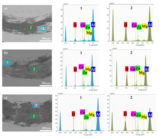 SEM micrographs: backscatter secondary electrons (BSE) and two areas analyzed with SEM-EDS of the Al-6061 aluminum alloy, under low, medium, and high conditions of load and sliding speed ((a) 1 N and 4 cm/s, (b) 2 N and 7 cm/s, (c) 3 N and 10 cm/s).