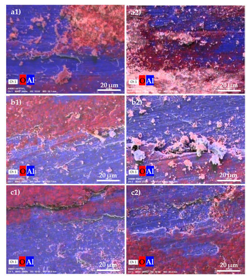 Elemental mapping of worn surface at high magnification for the Al-6061 aluminum alloy (a1–c1) and aluminum composite (a2–c2), under low, medium, and high conditions of load and sliding speed (1 N and 4 cm/s, 2 N and 7 cm/s, 3 N and 10 cm/s).