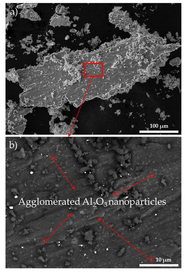 SEM images of the wear fragments after wear tests in the Al-6061-Al2O3 with 5 wt.% nanoparticles show the distribution of alumina nanoparticles in the wear fragments (see Figure 12). Here, it is possible to observe that Al2O3 particles appear embedded into the aluminum matrix composite. In this context, the literature suggests that the separation of abrasive particles such as oxides, carbides, nitrides, and others from the metal matrix can accelerate the removal of particles during wear tests which, as seen in this work, does not happen [34,35,38,39,44]. Particles embedded into the metal matrix can help enhance their wear performance due to an effective load transfer from the matrix to the reinforcement, as shown in the present study.