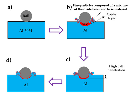 Schematic representation of wear evolution in the Al-6061 aluminum alloy. (a) Initial conditions, (b) first evolution of wear test, (c) second evolution of wear test, and (d) final evolution of wear test.