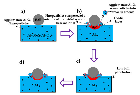 Schematic representation of wear evolution in the Al-6061-Al2O3 aluminum composite. (a) Initial conditions, (b) first evolution of wear test, (c) second evolution of wear test, and (d) final evolution of wear test.