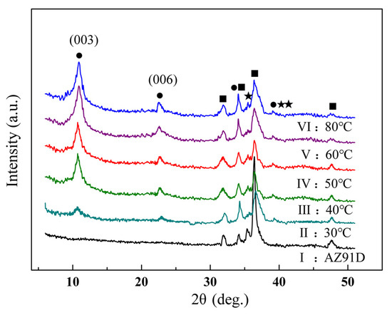 - Wu, L.; Pan, F.S.; Liu, Y.H. Influence of pH on the growth behaviour of Mg-Al LDH films. Surf. Eng. 2018, 34, 674–681. [Google Scholar] [CrossRef]