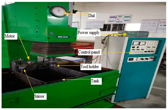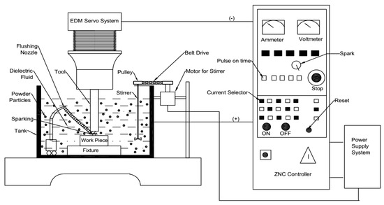 Nimonic-90 is a nickel-cobalt-chromium based superalloy used at high temperature applications in aerospace, defense, marine, nuclear, and power plant industries. Nimonic-90 superalloy is used for the manufacturing of components including exhaust re-heaters, ring sections, jet engines, turbine blades, and hot working tools. This is due to its excellent mechanical properties, namely its good corrosion resistance and high creep, rupture strength, and chemical resistance. However, the conventional machining of Nimonic-90 reported certain difficulties such as built-up-edge formation, localization of shear stress, premature notching of tools, and burr formation due to its low thermal conductivity and high melting point [1,2,3,4]. Thus, advanced machining processes, namely laser beam, abrasive water jet, electron beam, and electrical discharge machining (EDM), were employed to overcome such difficulties faced by conventional machining. Among these non-conventional machining processes, EDM offers reasonable attention on the machining of Nimonic-90, regardless of material hardness and complex profiles with higher automation [5,6]. In the EDM process, material is removed by electrical spark due to melting and evaporation when both electrodes are immersed in dielectric. However, due to low the machining rate and surface quality, EDM has been limited to industrial-related applications [7,8,9,10]. Thus, powder mixed EDM (PM-EDM), as a hybrid machining process, was developed to machine difficult-to-cut materials. In the PM-EDM process, fine powder is mixed in dielectric to enhance the machining rate of the EDM process and the surface quality of the machined specimen. Powder, when added to dielectric, gets invigorated, and acts in a zigzag motion, lowering the dielectric strength and increasing the inter-electrode gap. Due to this, powder particles arrange in a chain form, causing a short circuit, and leading to early explosion. Thus, multiple sparks are generated under the discharge zone, forming a shallow crater with uniform erosion with an enhanced material removal rate and better surface finish. The application of the PM-EDM process is mainly in the mold and dies industry; however, at present, it is also used in the automobile and aerospace industry for finishing of the manufactured parts [11,12,13,14,15,16].