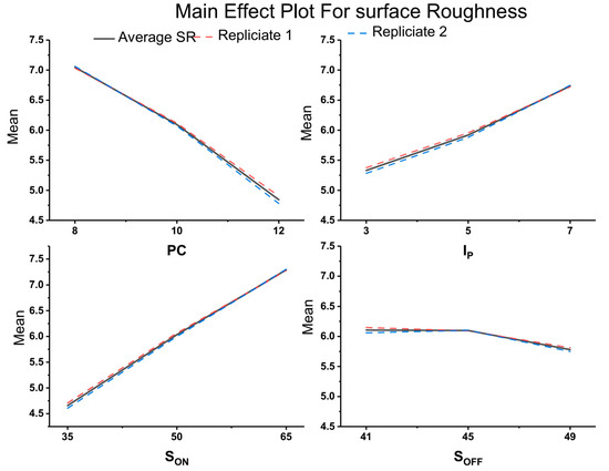 Figure 3 illustrates the main effect plot describing the influence of process parameters on SR. From Figure 3, upon increasing PC, a decrease in SR was noticed. Lower SR (3.216 µm) was noticed at PC = 12 g/L. Lower SR at a higher PC was due to the formation of a small shallow crater due to multiple sparking with uniform discharges across tools and workpieces owing to a less impulsive force. An increase in SR was revealed in Figure 3, after increasing both IP and SON. This was due to the higher spark energy available for melting material from workpiece surfaces, as spark energy is proportional to IP and SON. High spark energy results in an increase in plasma channel pressure, generating impulsive force and creating irregular surfaces [8,20,25]. A decrease in SR was noticed after increasing SOFF in Figure 3. With an increase in SOFF, uniform erosion takes from the workpiece. Moreover, more time is available for flushing the molten debris particles from the machined workpiece surface, lowering SR [34,46,47]. The minimum SR (3.216 μm) was obtained at PC = 12 g/L, IP = 5 A, SON = 35 μs, SOFF = 49 μs corresponding to experiment no. 8.