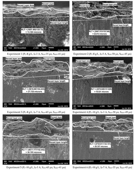 SR and RLT are considered output responses for this present study. Repetitions are multiple experimental runs with the same factor settings (levels). Repetitions are necessary to estimate experimental error and provide the conditions required to test the hypothesis or hypotheses formulated. According to a literature survey, at least two repetitions for each reading are necessary [31,32]. Thus, two repetitions were considered in this experimentation in order to obtain more reliable data, and the average was considered for analysis purpose. Surface roughness profilometer (Model SJ-410, Prayagraj, India) was used to measure SR at three separate locations of the machined surface, and the average was considered for study. For RLT, machined surface was cut in a transverse section using WEDM and then the cut section was polished using different grades of emery paper and etched with Nistal reagent. Then, an image of the recast layer at different magnifications was taken from a scanning electron microscope (SEM, Kanpur, India), Model JSM-6010LA. For measurement of RLT, SEM image was imported in ImageJ (V8, NIH, Prayagraj, India), software and Equation (1) was used for calculation [33,34].