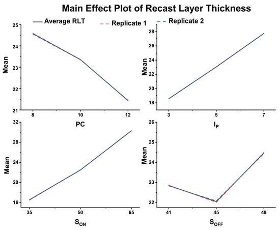 - For RLT, SON was the most significant process parameter, followed by IP and PC. However, SOFF had a negligible effect. A decrease in RLT was noticed with an increase in PC and a decrease in IP and SON. A decrease in RLT was noticed with an increase in SOFF up to the optimum level and with further RLT increases;