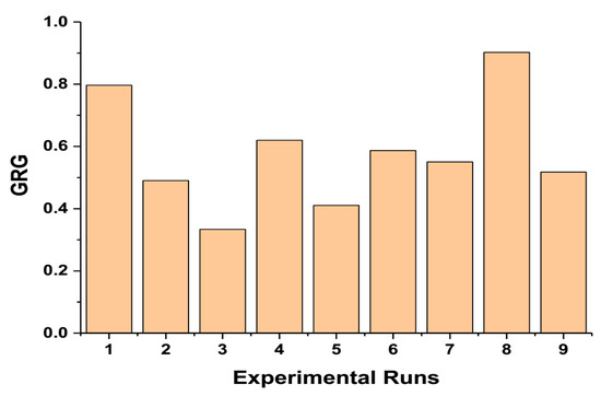 GRG is the average of the summation of all GRCs of ith experiment, and ‘n’ represents the number of response parameters and is computed using Equation (5) [23,43]. GRG value varies between 0 and 1.