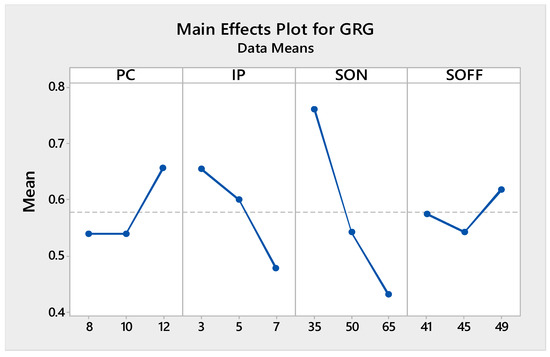 As observed from Table 8 and Figure 7, the maximum GRG was corresponding to level 3 of powder concentration, level 1 of discharge current, level 1 of spark on duration, and level 3 of spark off duration. Hence, it is the optimal setting and optimum process parameters for minimum SR, and RLT was at PC = 12 g/L, IP = 3 A, SON = 35 μs and SOFF = 49 μs.