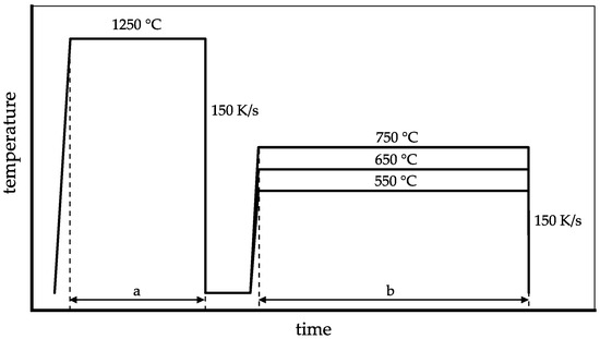 To tailor the precipitation of Laves phase, heat treatments were performed in a Bähr 805 A/D dilatometer under argon atmosphere on samples with a size of 7.0 mm × 4.0 m × 1.4 mm. During forging and air-cooling, strain-induced precipitation of inadvertent large Laves phase particles took place. To investigate the influence of aging on the precipitation of the Laves phase, it is mandatory to conduct solution annealing (1250 °C, 1h) to dissolve this phase followed by quenching to room temperature (cooling rate 150 K/s). Quenching was followed directly by an aging treatment for 0.5–192 h to thermally induce precipitation of the Laves phase. Based on thermodynamic simulations, temperatures of 550, 650, and 750 °C were selected for aging. The applied process chain is displayed in Figure 1.