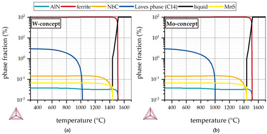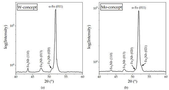 The main peak in Figure 4a as well as in Figure 4b was identified at an 2 angle of 51.9° (a) and 51.8° (b) as ferrite. The two peaks in Figure 4a at 43.6° and 47.6° are identified as Fe2Nb. The peak at 50.8° slightly coincides with the ferrite peak. Nevertheless, indexing Fe2Nb is possible. In Figure 4b, there are three Fe2Nb peaks at 43.5°, 47.5°, and 50.8°. Compared to the W-concept (Figure 4a), another Fe2Nb peak occurs at 52.6° in the Mo-concept. Both peaks at 50.8° and 52.6° coincide with the ferrite peak. However, the intensity of both peaks is high enough to indicate the Fe2Nb phase.