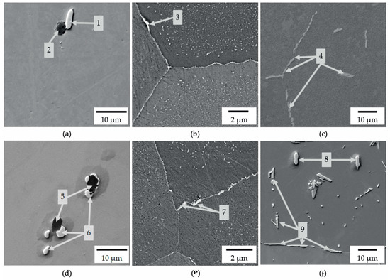 In a combined analysis of BSE images and EDS measurements (Figure 3, Table 2), precipitations no. 1, 6, and 8 mostly contain Nb and C. These precipitates are most likely the predicted NbC. Precipitations no. 2 and 5 contain mostly Al and N. These precipitates are most likely AlN. Both types of precipitations are also calculated by thermodynamic simulations (Figure 2). MnS could not be identified. After aging at 650 °C for 8 h (Figure 3b,e), new precipitates could be detected on the grain boundaries as well as inside the grain. The chemical composition of these phases is given in Table 2.
