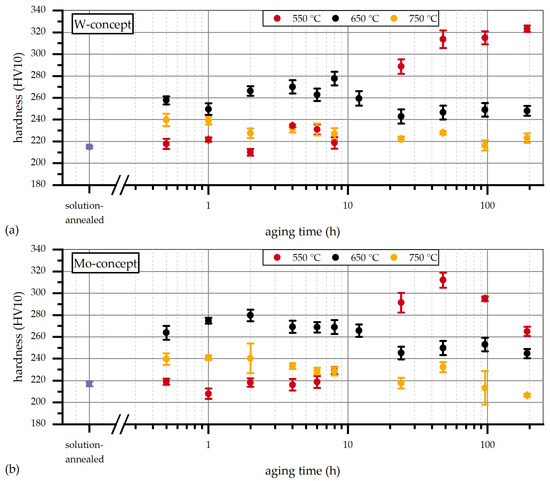 In order to estimate the influence of the intermetallic Laves phase on the strength of the alloys, hardness measurements were carried out. The hardness profile as a function of aging time for different temperatures can be seen in Figure 5. In the solution-annealed state, the hardness for both concepts is between 215 and 220 HV10. In this state, the hardness is mainly attributed to solid solution hardening as a result of alloying with Nb, W, Mo, Al, Si, and Mn. The impact of these elements on solid solution hardening was also reported by other studies [41,42,43,44].