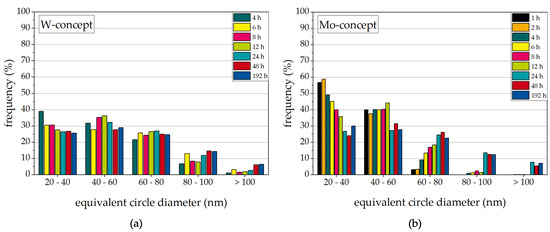 It is interesting to note that in the Mo-concept a hardness of 280 HV10 is achieved after only 2 h, whereas in the W-concept a hardness of 280 HV10 is only reached after 8 h. In a different study [63], it was already shown that the precipitation of the Fe2Nb phase is accelerated by the addition of Mo. While in the Mo-concept Laves phase can already be found inside the grains after 2 h, in the W-concept, the Laves phase is mainly found along grain boundaries. Precipitation in the grain interior has not yet taken place. Complete precipitation in the grain interior can be found after 4 h in the W-concept. Comparing the diffusion coefficients of alloying elements in α-Fe, Mo has a higher diffusion coefficient at 650 °C (DMo in α = 3.46 × 10−19 m2/s) than W (DW in α = 2.19 × 10−19 m2/s) [64,65]. In the Mo-concept, the incorporation of Mo into the Laves phase can therefore proceed faster than the incorporation of W in the W-concept, which is why the growth of the Laves phase proceeds faster in the Mo-concept. Dong et al. [10] reported that the coarsening of the Laves phase in connection with W proceeds more slowly than with Mo. This is also supported by Figure 6. While in the Mo-concept, the frequency of particles with an ECD of 20–40 nm tends to decrease with increasing holding time and the frequency of particles in the 60–80 nm class range increases, and no significant change can be found in the W-concept.
