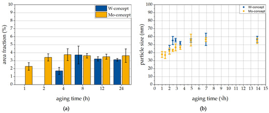 Area fraction of Laves phase in dependency of aging time (a) and particle size as function of the square root aging time (b) both aged at 650 °C for W- and Mo-concept.