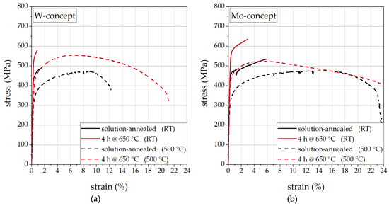 Stress–strain curves recorded at room temperature and at 500 °C of tensile samples of W-(a) and Mo-concept (b) in solution annealed state as well as aged at 650 °C for 4 h.
