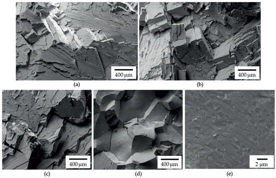 Figure 9e shows small precipitates on the fracture surface of Mo-concept aged at 650 °C for 4 h. The chemical composition of these particles can be seen in Table 4. Comparing the measurement results from Table 2 and Table 4 and additionally considering the discussion in Section 3.2, the precipitations on the fracture surface were identified as Laves phase. Therefore, the toughening of the material would require a grain refinement. Respective investigations, applying thermomechanical treatment aiming at dynamic recrystallization, are subject of ongoing work.