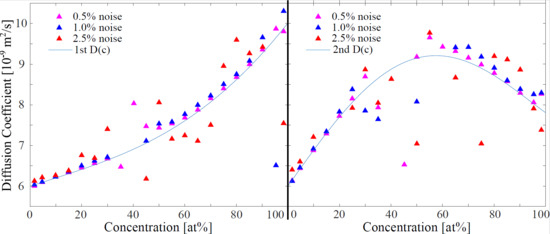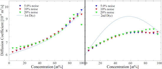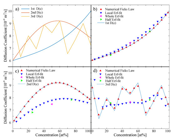 In order to model different concentration-dependent diffusion coefficients, we chose three different as input coefficients for the simulation (Figure 1a), to show the robustness and sensitivity of the four analyzing approaches. The diffusion coefficients are selected in an order of magnitude (5 to 10 × m/s) which corresponds to most metallic melts [15,36,37,38].