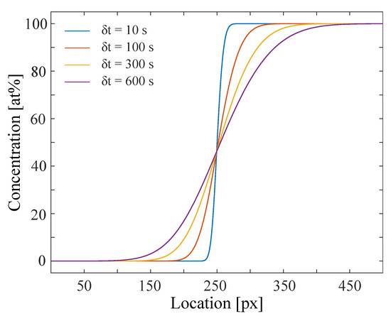 Interdiffusion simulation of a concentration profile starting from a step function of maximum concentration difference (0 and 100 at% of specimen B in A) propagating with time. The diffusion coefficient ranges from 6 to 10 [ m/s] (referred to 1st of Figure 1).