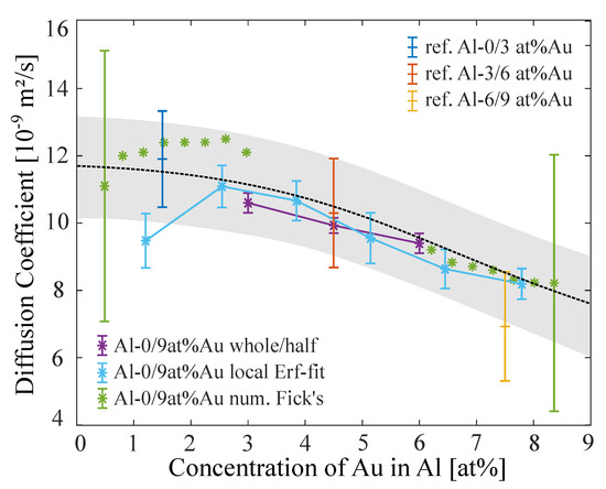 Figure 6 shows the results of the different analyzing approaches on the Al–Au SC data sets. The whole/half results show good agreement with the reference measurement. The left/right arms of the half Erf-fit approach also show a decrease of the diffusion coefficient with increasing Au-content in the Al-melt.
