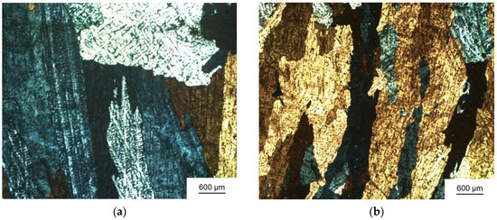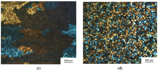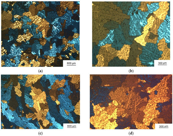 The grain structure of the samples was examined using a Carl Zeiss Axiovert-40 MAT optical microscope (Carl Zeiss AG, Oberkochen, Germany). The preparation of microsections included cutting out samples, mechanical grinding, polishing, as well as electropolishing in a fluoroboric electrolyte of the following composition: boric acid—11 g, hydrofluoric acid—30 mL, distilled water—2200 mL. For each sample, the mean grain size was measured by the linear intercept method.