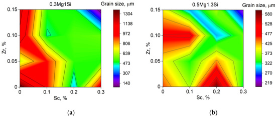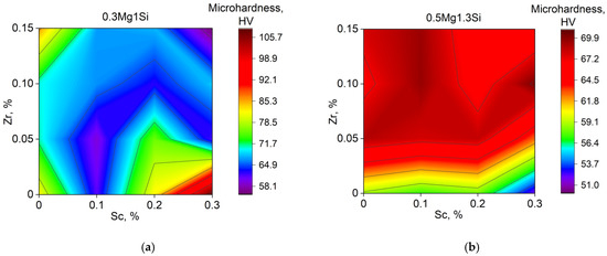 The results of microhardness measurements are very interesting. It is generally higher (Figure 4a) in an alloy with a higher silicon content than in an alloy with a low silicon content (Figure 4b). This can be explained by the fact that alloy Al0.3Mg1Si contains more particles of the type (AlSi)3ScZr and/or AlSc2Si2 than Al0.5Mg1.3Si. They can appear due to the fact that the cooling process during casting requires a certain time, which is sufficient for the precipitation of a certain amount of these particles from the supersaturated solid solution [26]. An increased ratio of magnesium and silicon will accelerate the precipitation of these particles from the supersaturated solid solution and thereby increase the microhardness. At the same time, an increase in the zirconium content will reduce the ability to form them upon cooling, since this element reduces the diffusion of scandium [19]. As for the Al0.5Mg1.3Si alloy (Figure 4b), it can be assumed that grain refinement, associated with an increase in the proportion of zirconium and scandium, will have a stronger effect than a decrease in the diffusion of the latter. As mentioned earlier, due to the larger amount of Mg and Si, the refinement of the grain structure will be much stronger. Therefore, the length of grain boundaries is longer. The latter, in turn, serve as an additional source in the formation of secondary metastable particles, contributing to an increase in their number [38]. Note that the effect of the grain structure size can be excluded, since this indicator begins to exert a significant effect on the microhardness when reaching submicron sizes. Even in alloys with the finest grains its size is several microns.
