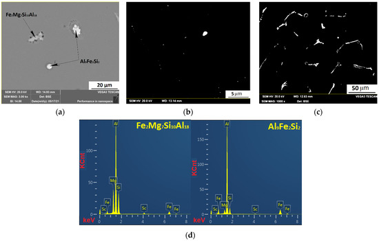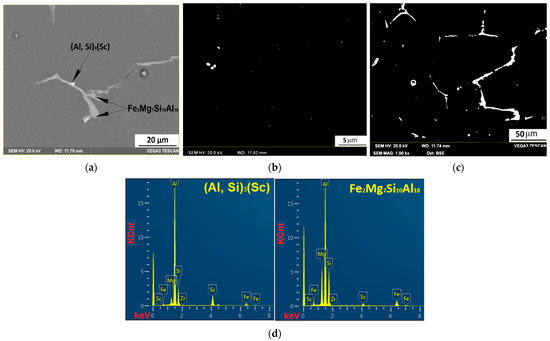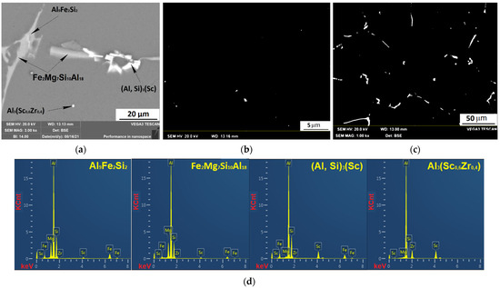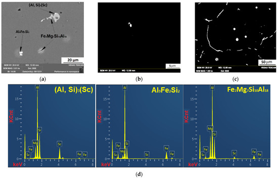 Al0.3Mg1Si0.3Sc main types of intermetallic compounds (a); small dispersoids (b); large particles (c); result of the energy-dispersive spectroscopy (EDS) investigation of chemical composition of the intermetallic compounds (d).