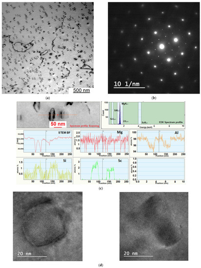 A different picture of the distribution and chemical composition of fine particles is observed in the Al0.5Mg1.3Si0.3Sc alloy. It also contains the (AlSi)3Sc-type particles but their number is somewhat less than in the Al0.3Mg1Si0.3Sc alloy (Figure 11a). However, in general, they have the same size and the same chemical composition. In addition, needle-shaped particles similar to β″ (Mg5Si6) appear (Figure 11b,c).