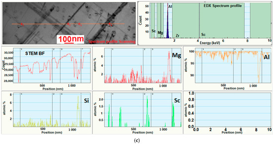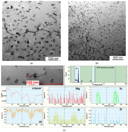 (a) Al3Sc coherent and semi coherent particles particles; (b) Al3Sc coherent and semi coherent particles + Mg2Si (rod-like) particles (c) EDS profile line scan.