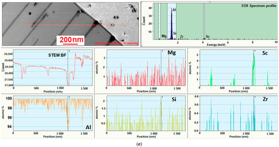 (a,c,d) Discontinuous precipitation of (AlSi)3ScZr needle-shaped particles; (b) (AlSi)3ScZr particles with the L12-structure, (c) discontinuous precipitation of (AlSi)3ScZr needle-shaped particles near high-angle boundaries. (e) EDS profile line scan.