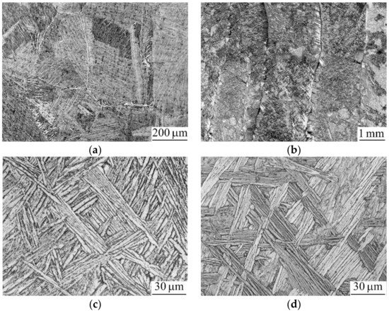 Typical microstructures of the wrought and EBAM Ti-6Al-4V samples are shown in Figure 2. The wrought samples are characterized by equiaxed prior β grains 500 µm in diameter (Figure 2a). In contrast, columnar β grains oriented along the growth direction were formed in the EBAM samples (Figure 2b). The cross-sectional dimensions of the columnar grains vary from 1.5 to 3.0 mm, while their height reaches 20 mm. Disoriented colonies of α laths are observed within the large-body prior β grains in both wrought and EBAM samples (Figure 2c,d). The cross-sectional size of the α laths in the wrought samples varies within 3–5 µm, whereas the α laths in the EBAM samples are somewhat thinner (2–3 µm).