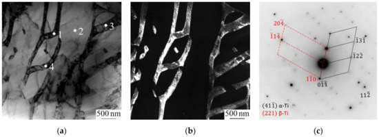 The lamellar structure of the secondary α phase with β interlayers is also observed in the EBAM Ti-6Al-4V samples. In addition, their TEM micrographs exhibit fragmented primary α laths, where the fragments with dimensions of 0.7–1 µm are separated by long disoriented α interlayers ≈200 nm thick consisting of dislocation pile-ups with a dislocation density of 3 × 109 m2 (Figure 4). The vanadium content in the fragments is 4.6 wt%, while in the disoriented α interlayers, it varies within 6.7–10 wt% (see Figure 4a and Table 3), which substantially exceeds the maximum solubility of vanadium in HCP titanium (2.9 wt%). The torsion curvature of the crystal lattice of the fragmented α laths was estimated as 7 deg/μm.