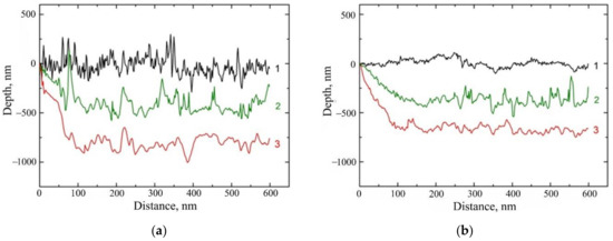Longitudinal surface profiles of scratch grooves in the wrought (a) and EBAM (b) Ti-6Al-4V samples: 1—initial surface profile, 2—residual scratch profile, 3—scratch profile under loading.