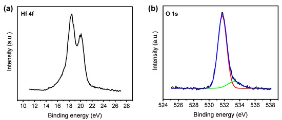 Figure 1a,b shows the XPS spectra of Hf 4f and O 1s of the surface of the HfO2 film. Two local peaks at 18.48 eV and 20.08 eV corresponding to Hf 4f7/2 and Hf 4f5/2 (Figure 1a), respectively, were observed [50], in addition to the two distinctive peaks for lattice oxygen and defect oxygen at 531.72 eV and 533.3 eV, respectively (Figure 1b). Defect oxygen indicates the oxygen vacancies initially existing in the HfO2 film [51], indicating that the HfO2 film deposited by XPS exhibits non-stoichiometry.