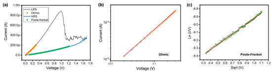 (a) Fitting process of the I–V curve in the linear scale for the conduction mechanism. (b) Log–log scale in the LRS. (c) Ln (I/V) versus sqrt (V) in the HRS.