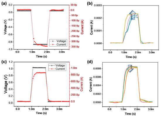 Pulse transient characteristics: (a) set process and (b) current increase by identical set pulses, (c) reset process and (d) current decrease by identical reset pulses.