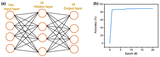 Finally, we calculate the accuracy of Fashion MNIST recognition by constructing a neural network (784 × 16 × 10), as shown in Figure 6a. Based on the measured conductance of the Pt/TaOx/TaN device, a pattern recognition test was simulated. To classify the image patterns of the Fashion MNIST dataset, first, 28 × 28 pixel images are rearranged in a one-dimensional array (784 × 1), and the pixel image exhibits values from 0 to 1 for 784 input neurons. The input layer nodes are fully connected to the 16 hidden layers that are fully connected to the 10 output neurons corresponding to the 10 classes of training and test images. The neurons of each layer are fully connected with the artificial synapse devices, which have quantized weight values. The imaginary cross-point array can perform a vector-matrix multiplication operation to update the synapse weight. Figure 6b shows the accuracy as a function of the epoch in which the accuracy at the 20th epoch is 89.07%.