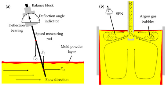 In our previous paper, a new high temperature quantitative velocity measurement method called RDM was proposed [18]. Figure 1a shows the RDM for measuring velocity near the mold surface, and Figure 1b shows the measured position and the flow field in the mold with argon gas blowing. It is seen from the figures that the experimental apparatus consists of four parts: a speed measuring rod, deflection bearing, deflection angle indicator and balance block. The speed measuring rod is inserted vertically into the molten steel for 50 mm at the position to be measured. It can last for 30 s without melting. At this time, the speed measuring rod is subjected to its own gravity and the buoyancy and the impact force of molten steel flowing near the mold surface. The three forces reach torque balance, resulting in the speed measuring rod being deflected at a certain angle. As the turbulent flow field in the mold is unstable, the deflection angle of the speed measuring rod fluctuates slightly. We read more than 10 deflection angle values within the 30 s. Three speed measuring rods were are used for the measurements under the same continuous casting condition and we finally obtained more than 30 measurement values. The average velocity of molten steel at the measured position can be calculated from the average value of 30 measurement values. The detailed method can be found in our previous work [18].