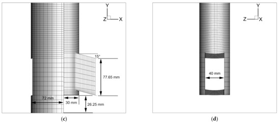 Figure 2. (a) Grid partition for the mold with the thickness of 180 mm; (b) grid partition for the mold with the thickness of 250 mm; (c) front view of geometric details of the concave bottom SEN with inclination angle of 15°; (d) side view of nozzle side hole.