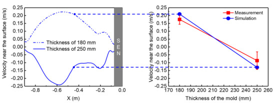 Figure 5. Comparison of velocities near the mold surface between slab thicknesses of 180 and 250 mm at 1800 mm width, 10 L/min argon gas flow rate and 2.65 t/min throughput.