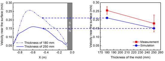 In addition, the velocity of molten steel near the mold surface at 1/4 width is usually the maximum velocity near the mold surface. The velocity fluctuation here is the largest, and the velocity changes are the most sensitive to the process parameters. We chose this typical velocity to compare the experimental and simulated results.