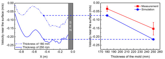 In the present work, the industrial high temperature quantitative measurement of the velocity near the mold surface and a numerical simulation were combined to analyze the flow field in slab molds with section sizes of 1800 × 180 mm and 1800 × 250 mm, respectively. The flow fields in the molds with the different slab thicknesses under the same throughput, argon gas flow rate, nozzle type and nozzle immersion depth were compared. The flow fields at three groups of throughput and argon gas flow rate were compared, respectively. The selected groups of process parameters are commonly used in industrial production, giving them certain representativeness and industrial significance. RDM was used to measure the velocity of molten steel at 1/4 width and the center of mold thickness near the mold surface. In the numerical simulation, the K-ε two-equation model was adopted to describe the turbulent flow. The volume of fluid method (VOF) was employed to track the steel-slag interface, and the argon gas bubbles were simplified as Langrangian particles.