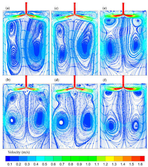 Figure 6 shows the velocity fields in the thickness center slice of the molds, and the velocity magnitude is distinguished by color. In addition to the slab thickness, the throughput and argon gas flow rate are pairwise consistent in Figure 6a–f. Owing to the symmetry of the computational domain and boundary conditions, the velocity field was roughly symmetrical in the width direction.