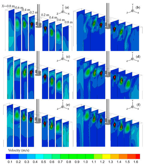Figure 7. Velocity fields on the width of X = −0.8, −0.6, −0.4, −0.2, 0.2, 0.4, 0.6, 0.8m slices of the mold, in (a) case 1, (b) case 2, (c) case 3, (d) case 4, (e) case 5, (f) case 6.