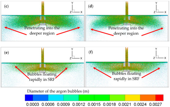 Figure 8. Distribution of the argon bubbles in the mold, in (a) case 1, (b) case 2, (c) case 3, (d) case 4, (e) case 5, (f) case 6.